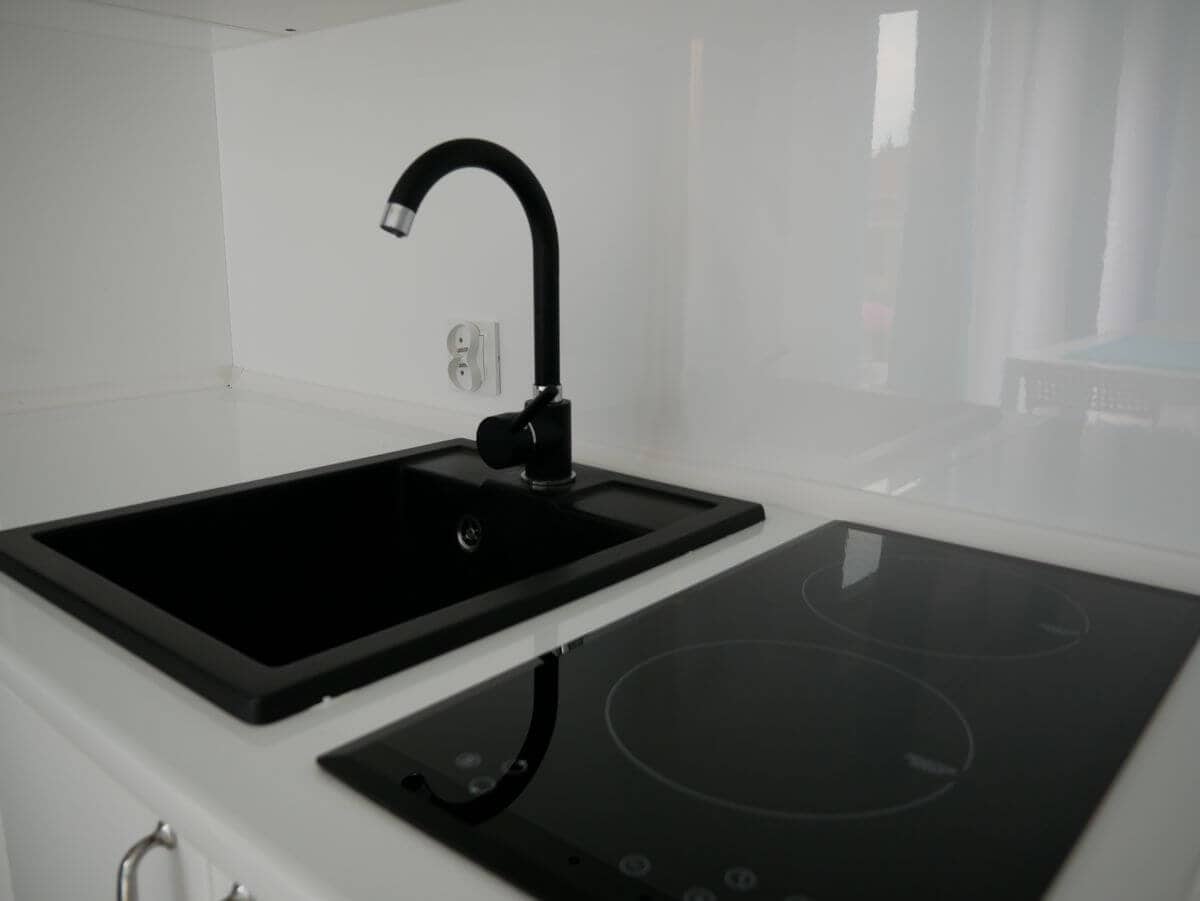 Im Wohnbereich befinden sich eine Schlafcouch, ein Couchtisch, ein Esstisch mit vier Stühlen sowie ein Smart-TV. Das Schlafzimmer ist mit einem Doppelbett und einem großen Kleiderschrank mit Spiegelfront ausgestattet. Die Küchenzeile umfasst Einbaumöbel, ein Zweiplattenkochfeld und einen Kühlschrank. Alle Apartments verfügen über elektrische Fußbodenheizung sowie Warmwasseraufbereitung über ein Ariston-System, das sich bequem per WLAN steuern lässt.
