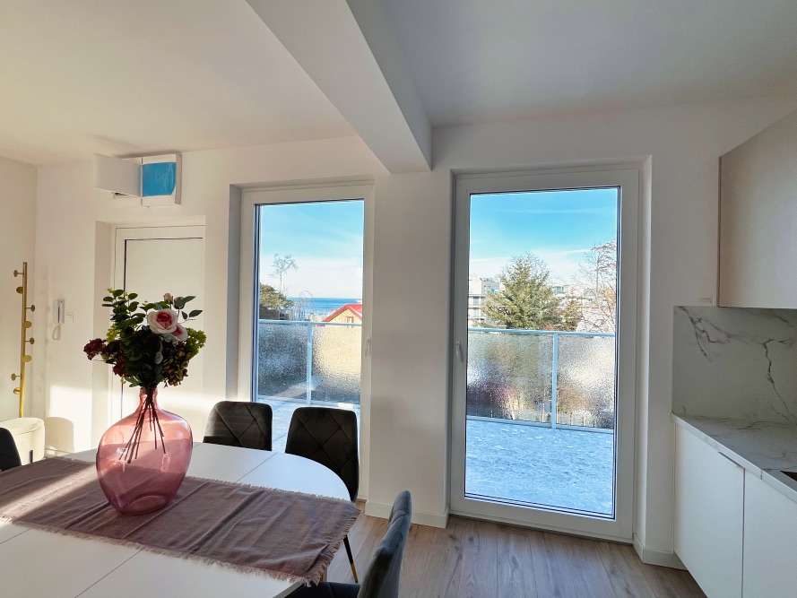 Der große Wohn- und Essbereich bildet das Herzstück der Wohnung. Die offene Küche ist harmonisch integriert und schafft einen modernen, kommunikativen Raum für Wohnen und Genießen. Große Fenster nach Westen und Osten sorgen den ganzen Tag über für eine helle und freundliche Atmosphäre. Von beiden Seiten eröffnet sich der Blick auf die Ostsee, ein seltenes und besonders attraktives Merkmal.