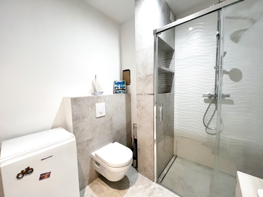 Das Badezimmer ist modern ausgebaut und überzeugt mit einer großzügigen Dusche inklusive praktischer Ablagefächer sowie hochwertigen Armaturen. Die Wohnung wird ohne Einbauküche angeboten, sodass die Küche ganz nach den eigenen Vorstellungen geplant und umgesetzt werden kann.